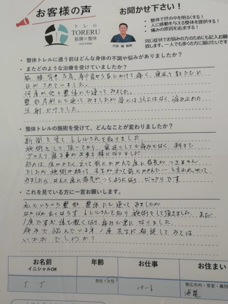最高気温25℃ 夏ですね(笑) お日様浴びて 外で治療したいっす 当店の感想 「お客様の声」も続々と集まっています。 ありがたいです。感謝 今回のお客様は 2回で終了したお客様です。 寝返りの度に痛い! 毎回寝返りする度に 首から背中にかけて 痛くて... -
